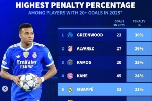 體育資訊12月4日訊 《轉會市場》統計了2025年五大聯賽各項賽事進球超過20球的球員的點球占比情況,格林伍德獨自領跑。