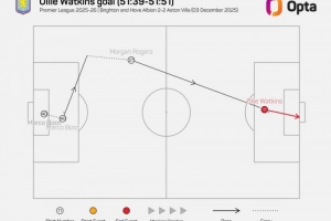 體育資訊12月4日訊 維拉在本輪英超對陣布萊頓,羅杰斯助攻沃特金斯破門。