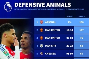 92-93賽季以來英超球隊連續失球少于3粒比賽場次紀錄: