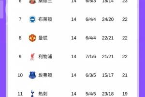 曼聯(lián)前14輪排名: