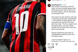 體育資訊12月5日訊 今日,首爾FC官方宣布林加德將在賽季結束后離隊,隨后林加德也在社媒發文,告別首爾FC。