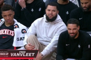 在比賽中,狄龍和在替補席上的范弗里特互動,后者說道:“40分,你有得過40分嗎?讓我見識一次,讓我們看看?!?/p>