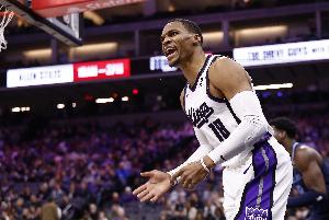上半場比賽,威少出戰15分半,投籃4中2,三分2中1,得到5分6助攻1搶斷,正負值+19。