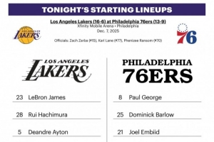 體育資訊12月8日訊 今日8點半,76人主場對陣湖人。賽前雙方公布了本場首發陣容: