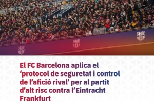 體育資訊12月8日訊 巴薩發布官方公告,12月10日4點在諾坎普球場對陣法蘭克福的歐冠比賽被列為“高風險賽事”,俱樂部已啟動嚴格的安保管控方案。