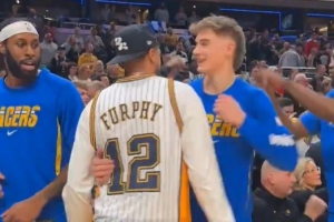 這場比賽,養傷中的哈利伯頓來到場邊觀賽,他身穿隊友弗菲的球衣以示支持,并與弗菲本人互動。