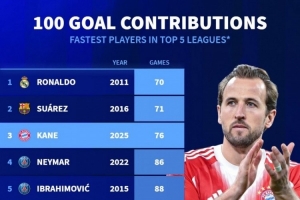 體育資訊12月9日訊 德國轉會市場統計了本世紀五大聯賽球員在單一聯賽參與100球所用的場次,并列出最快達成100球排名,C羅居首,蘇亞雷斯、凱恩二三位。