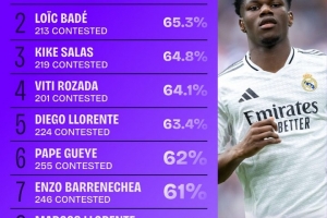 體育資訊6月30日訊 Squawka統(tǒng)計(jì)表明,瓊阿梅尼是2024-25賽季西甲對(duì)抗200+次的球員里,對(duì)抗成功率最高的球員。