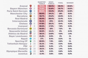 體育資訊12月9日訊 本賽季歐冠聯賽階段第6輪的比賽即將開打,opta在當地時間12月9日對本賽季歐冠的形勢進行了新一輪預測,阿森納奪冠概率22.6%最高,拜仁、巴黎排在二三位。