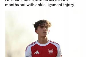 體育資訊12月10日訊 據TA記者奧恩斯坦消息,15歲阿森納小將道曼腳踝韌帶受傷,將傷缺2個月。
