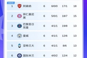 6輪過后,阿森納6戰(zhàn)全勝領(lǐng)跑,基本鎖定前8席位,曼城升至第4,本菲卡兩連勝靠近附加賽區(qū),重燃晉級希望。