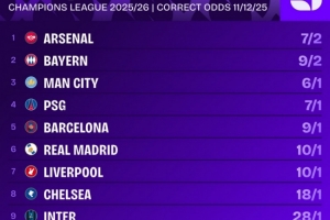體育資訊12月11日訊 歐冠聯(lián)賽階段第6輪比賽戰(zhàn)罷,相關(guān)機(jī)構(gòu)列出了各隊(duì)奪冠的賠率,阿森納居首。