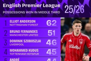 體育資訊12月11日訊 Squawka統計了本賽季球員在英超中場區域(中場三區)奪得球權的次數,并列出榜單,安德森62次居首,B費、索博斯洛伊排名二三位。