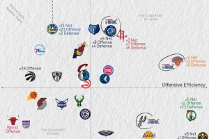 橫軸代表進(jìn)攻效率,越靠右越好,縱軸代表防守效率,越靠上越強(qiáng)。第一象限的球隊(duì)多為發(fā)揮出色的球隊(duì),而在第三象限的球隊(duì)通常為戰(zhàn)績(jī)比較糟糕的球隊(duì)。