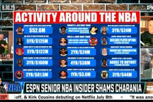 體育資訊07月01日訊 名記Shams在播客節目《PatMcfeeShow》的直播中連續說了兩遍:“今晚會有大交易,今晚會有大交易(There's gonna be some BIG deals)!”