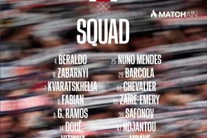 前鋒:7-克瓦拉茨赫利亞、9-貢薩洛·拉莫斯、14-杜埃、19-李剛仁、29-巴爾科拉、47-恩賈恩圖、49-姆巴耶