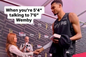 NBA女記者Rachel Nichols曬出了與文班握手照,配文:“當1米63的你和2.32的文班(實為2米24)對話。”