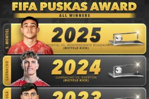 體育資訊12月16日訊 2025年普斯卡什獎(jiǎng)公布,25歲的阿根廷球員圣地亞哥·蒙鐵爾憑借一記禁區(qū)外的精彩倒勾獲獎(jiǎng)。算上這粒進(jìn)球,普斯卡什已經(jīng)連續(xù)4年由倒勾進(jìn)球當(dāng)選。