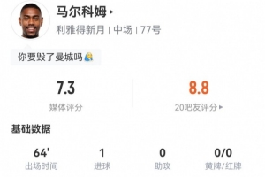 馬爾科姆本場3射1正進1球 1關鍵傳球+3過人2成功 獲評7.3分