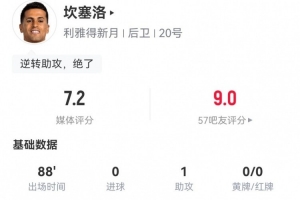體育資訊7月1日訊 利雅得新月在世俱杯16強(qiáng)戰(zhàn)常規(guī)時(shí)間2-2戰(zhàn)平曼城,面對(duì)舊主的坎塞洛本場(chǎng)數(shù)據(jù)如下:
