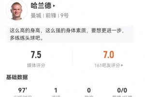 體育資訊7月1日訊 利雅得新月在世俱杯16強戰常規時間2-2戰平曼城,哈蘭德本場數據如下: