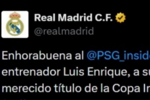 皇馬官方社媒也送上祝賀:“祝賀巴黎圣日耳曼俱樂部、主席納賽爾·阿爾赫萊菲、主帥路易斯·恩里克、球員以及所有球迷,你們完全配得上洲際杯冠軍。”