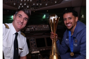 巴黎圣日耳曼球員們帶著獎杯乘坐飛機返回巴黎,俱樂部官方社媒曬出隊長馬爾基尼奧斯手拿獎杯與機長的合照,配文:“前往巴黎!”