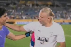 賽后哈蘭德?lián)е寂奶臁1緢?chǎng)比賽哈蘭德打進(jìn)一球,而布努本場(chǎng)神勇發(fā)揮貢獻(xiàn)10次撲救。