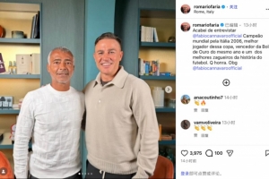 羅馬里奧在社媒寫道:“剛剛采訪了06年意大利隊世界杯冠軍成員、最佳球員、06年世界足球先生、前足壇最頂尖的后衛法比奧·卡納瓦羅。深感榮幸。”