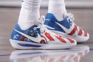 本場比賽,康寧漢姆穿上了客制版本的Nike GT Cut 3 PE,在美國隊長主題基礎(chǔ)上,將個人Logo融入到了美隊的形象當中。