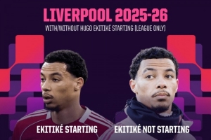 數據統計顯示,埃基蒂克本賽季英超首發情況下,利物浦10場7勝1平2負,場均打進2球、獲得2.2分。