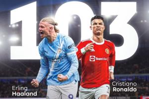 至此,哈蘭德在英超的進球已經(jīng)來到103粒,這追平了C羅在英超的進球數(shù)。