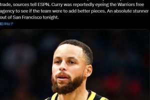 “突發(fā)新聞:據(jù)ESPN消息人士透露,金州勇士隊(duì)球星斯蒂芬-庫里已申請(qǐng)交易。據(jù)報(bào)道,庫里正在關(guān)注勇士隊(duì)自由球員市場,看看球隊(duì)能否引進(jìn)更優(yōu)秀的球員。今晚舊金山灣區(qū)發(fā)生了一件絕對(duì)令人震驚的事。”Chef Curry杜撰寫道。