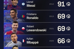 據Sofascore統計,姆巴佩2025年俱樂部+國家隊總計打進66球,本世紀自然年進球第四多。