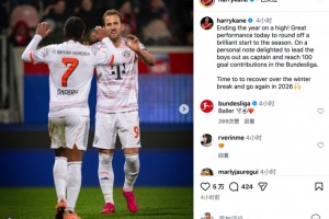 凱恩寫道:“以一場勝利收官這一年!今天的出色表現為本賽季的精彩開局畫上了圓滿句號。尤其令我欣喜的是,能以隊長身份帶領隊友出戰,并達成了個人在德甲聯賽中參與100粒進球的里程碑。”