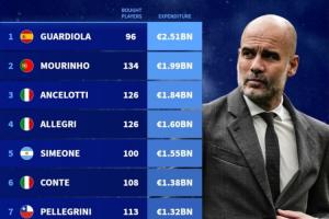 1.瓜迪奧拉:25.1億歐,引進96人