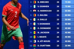 體育資訊12月27日訊 德轉列出了本屆非洲杯球員身價排行榜,阿什拉夫位列第一。