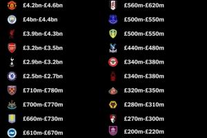 TA英超20隊球隊估值: