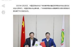 2025年12月26日,中國足球協(xié)會與廣州體育學院共建足球?qū)W院合作協(xié)議簽約儀式在北京舉行。中國足球協(xié)會主席宋凱,廣州體育學院校長胡敏等雙方相關領導和代表出席了本次簽約儀式。