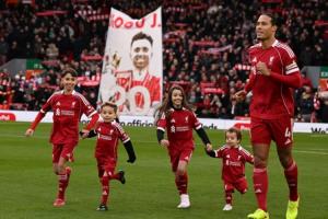 在比賽開場前,利物浦隊長范戴克帶領若塔的孩子們在安菲爾德球場踢球。