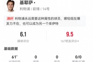 體育資訊12月28日訊 利物浦在本輪英超對(duì)陣?yán)顷?duì),本賽季首次在聯(lián)賽首發(fā)的小基耶薩本場數(shù)據(jù)如下:
