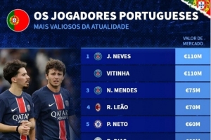 體育資訊12月28日訊 德國轉(zhuǎn)會市場列出了葡萄牙球員身價排名,若昂·內(nèi)維斯、維蒂尼亞1.1億歐居首。