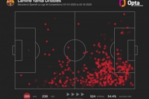 18歲的巴薩右邊鋒亞馬爾在今年各項(xiàng)賽事共計(jì)524次嘗試過(guò)人,285次成功過(guò)人是為五大聯(lián)賽球員同期最多。