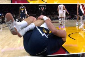 掘金當(dāng)家球星約基奇在半場(chǎng)比賽結(jié)束前被隊(duì)友斯潘塞·瓊斯踩到腿部誤傷致膝蓋過度伸展提前退賽。