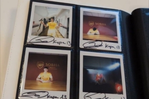 阿森納官方社媒曬出視頻,新援門將凱帕在簽約照片上簽名,這些照片被放入相冊收藏。