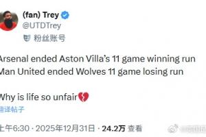 曼聯(lián)球迷:阿森納終結(jié)了維拉的11連勝,曼聯(lián)終結(jié)了狼隊的11連敗,為什么生活這么不公平!??