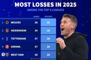 體育資訊1月1日訊 2025年已經結束,《轉會市場》也統計了本年度五大聯賽輸球場次最多情況,前五有3支英超球隊。
