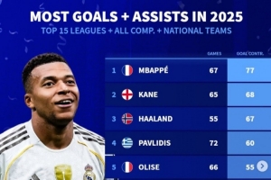 體育資訊1月2日訊 2025年已經過去,《轉會市場》也統計了2025前15聯賽球員的俱樂部+國家隊各項賽事總參與進球情況,皇馬前鋒姆巴佩領跑。