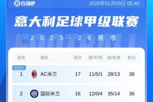 最新的積分榜方面:米蘭先賽2分優勢登頂,積36分排名第2的國米1月5日凌晨主場迎戰博洛尼亞,那不勒斯第3、羅馬第4。
