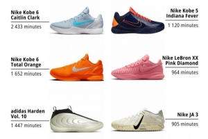 排名第一的是凱特琳·克拉克的PE配色Kobe 6 Protro,上腳時長為2433分鐘;